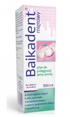 Butelka PVC zawierająca 300 ml płynu Baikadent miętowy, z miarką, w tekturowym opakowaniu.