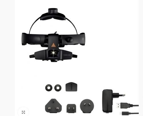 Zestaw zawiera; oftalmoskop pośredni OMEGA 600 (z baterią akumulatorową i okularami +2 D), ładowarkę sieciową E4-USBC, okulary 0 D