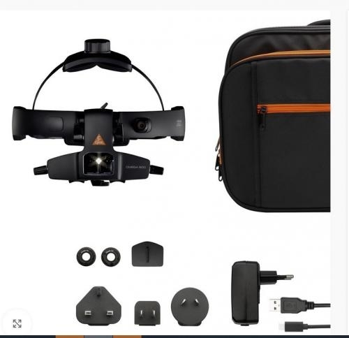 Zestaw zawiera; oftalmoskop pośredni OMEGA 600 (z baterią akumulatorową i okularami +2 D), ładowarkę sieciową E4-USBC, okulary 0 D, torbę transportową