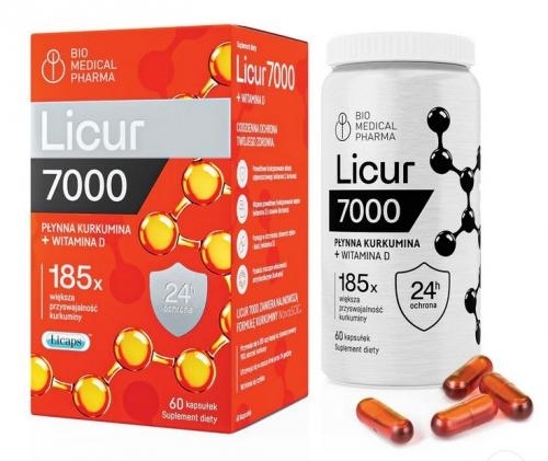 Licur 7000 + witamina D to nowoczesny suplement diety zawierający kurkuminę NovaSOL® o wyjątkowo wysokiej biodostępności, aż 185 razy lepszej niż tradycyjne ekstrakty z kurkumy oraz witaminę D3.