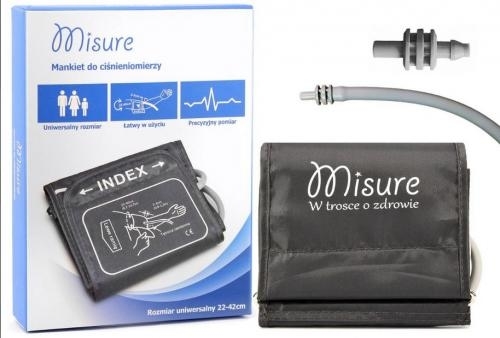 Uniwersalny mankiet do ciśnieniomierzy Misure pasuje na obwód ramienia od 22 do 42 cm i jest kompatybilny z każdym automatycznym ciśnieniomierzem jednowężykowym.