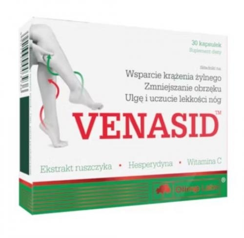 Suplement diety Venasid zawiera ekstrakt ruszczyka kolczastego, witaminę C oraz hesperydynę z owoców Citrus aurantium L. Składniki preparatu wspierają krążenie żylne, zmniejszają obrzęk, a także przynoszą ulgę i uczucie lekkości dla nóg.