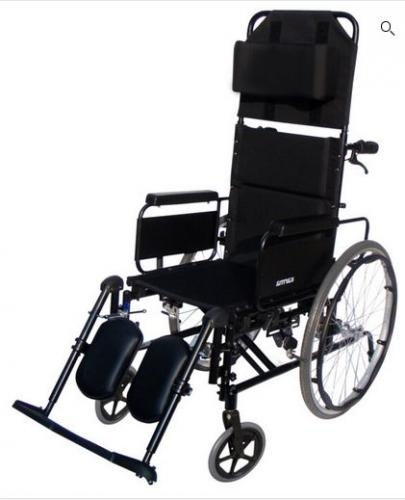 KM-5000 to lekki, aluminiowy wózek inwalidzki z regulowanym kątem pochylenia siedziska, podparciem głowy i nóg, odchylanymi podłokietnikami i hamulcem dla opiekuna.