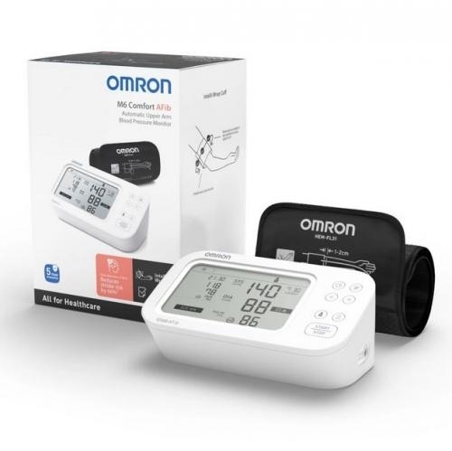 Ciśnieniomierz Omron M6 Comfort AFib, zalecany również dla diabetyków i kobiet w ciąży, z funkcją detekcji migotania przedsionków oraz technologią Intellisense.