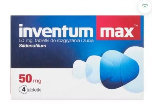Inventum Max to lek przeznaczony dla dorosłych mężczyzn z zaburzeniami erekcji. Zawiera syldenafil w dawce 50 mg – substancję, która wspomaga naturalny napływ krwi do prącia podczas pobudzenia seksualnego, pomagając osiągnąć i utrzymać wzwód.
