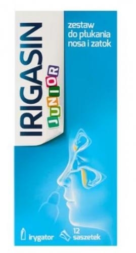 Irigasin Junior to wyrób medyczny przeznaczony do przygotowania roztworu do płukania nosa i zatok u dzieci. Zestaw składa się z dostosowanego do dzieci irygatora oraz 12 saszetek.