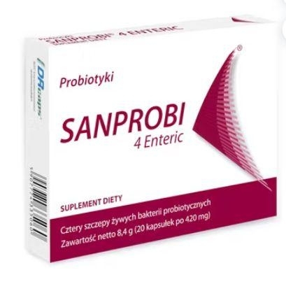 Suplement diety Sanprobi 4 Enteric to probiotyk wieloszczepowy, który zawiera unikalną kompozycję czterech szczepów bakterii probiotycznych. W preparacie zastosowano specjalną formę kapsułek DRcaps, dzięki której produkt rozpuszcza się dopiero w jelicie, a bakterie są chronione przed wpływem kwasu solnego w żołądku.
