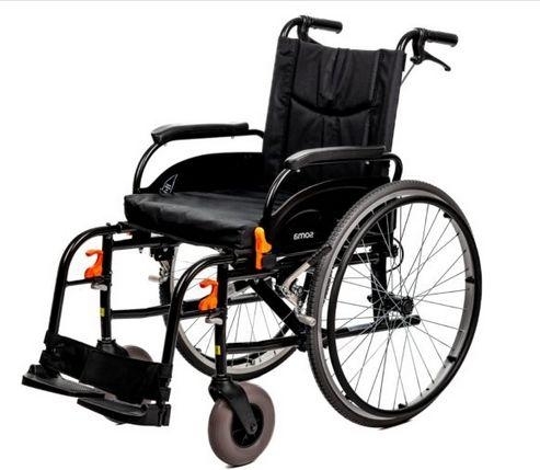 Wózek inwalidzki Agile z lekką aluminiową ramą, odchylanymi podłokietnikami i podnóżkami, pasem bezpieczeństwa, pompką i poduszką.